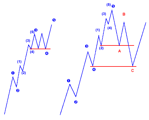 Występują najczęściej jako fala czwarta w impulsach. W trakcie tych korekt dochodzi do testowania szczytu ustanowionego przez poprzednią falę impulsu.