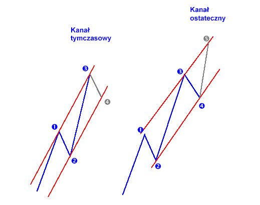 Do wyznaczenia tymczasowego kanału musimy poczekać na zakończenie fali 3. Górna linia łączy szczyty fal: 1 i 3. Dolna linia jest równoległa i biegnie przez dno fali 2. Tak wytyczony kanał jest użyteczny do prognozowania zakończenia fali 4.