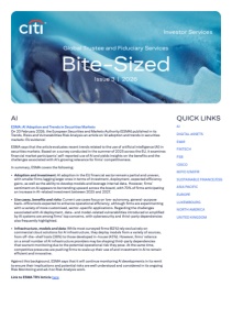 AI ESMA: AI Adoption and Trends in Securities Markets On 20 February 2026, the European Securities and Markets Authority (ESMA) published in its Trends, Risks and Vulnerabilities Risk Analysis an article on ‘Al adoption and trends in securities markets: EU evidence’. ESMA says that the article evaluates recent trends related to the use of artificial intelligence (AI) in securities markets. Based on a survey conducted in the summer of 2025 across the EU, it examines financial market participants’ self-reported use of AI and yields insights on the benefits and the challenges associated with AI’s growing relevance for firms’ competitiveness. In summary, ESMA covers the following: • Adoption and investment : AI adoption in the EU financial sector remains partial and uneven, with smaller firms lagging larger ones in terms of investment, deployment, expected efficiency gains, as well as the ability to develop models and leverage internal data. However, firms’ sentiment on AI appears to be trending upward across the board, with 70% of firms anticipating an increase in AI-related investment between 2025 and 2027. • Use cases, benefits and risks : Current use cases focus on low-autonomy, general-purpose back-office tools expected to enhance operational efficiency, although firms are experimenting with a variety of more customised, sector-specific applications. Regarding the challenges associated with AI deployment, data- and model-related vulnerabilities introduced or amplified by AI systems are among firms’ top concerns, with cybersecurity and third-party dependencies also frequently highlighted. • Infrastructure, models and data : While most surveyed firms (62%) rely exclusively on commercial cloud solutions for AI infrastructure, they deploy models from a variety of sources, from off-the-shelf tools (36%) to those developed in-house (43%). However, firms’ reliance on a small number of AI infrastructure providers may be shaping third-party dependencies that warrant monitoring due to the potential operational risk they pose. At the same time, competitive pressures are pushing firms to scale up their use of and investment in AI to remain efficient and innovative. Against this background, ESMA says that it will continue monitoring AI developments in its remit to ensure their implications and potential risks are well understood and considered in its ongoing Risk Monitoring and ad-hoc Risk Analysis work. Link to ESMA TRV Article here Investor Services Bite-Sized Global Trustee and Fiduciary Services QUICK LINKS Issue 3 | 2026 AI DIGITAL ASSETS EMIR FINTECH FSB IOSCO MIFID II/MIFIR SUSTAINABLE FINANCE/ESG ASIA PACIFIC EUROPE LUXEMBOURG NORTH AMERICA UNITED KINGDOM